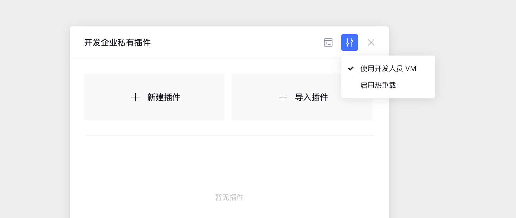 开发中的插件默认运行在一个沙盒中。此外,我们还提供了开发人员 VM 环境,允许你在当前浏览器环境中运行(不推荐使用该方式进行性能测试/最终验证,因为 VM 运行的性能和普通沙盒差异较大),以方便调试。